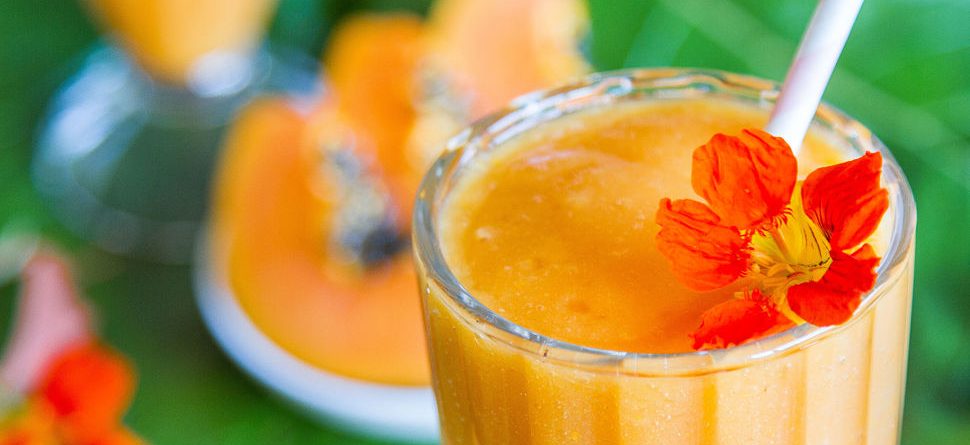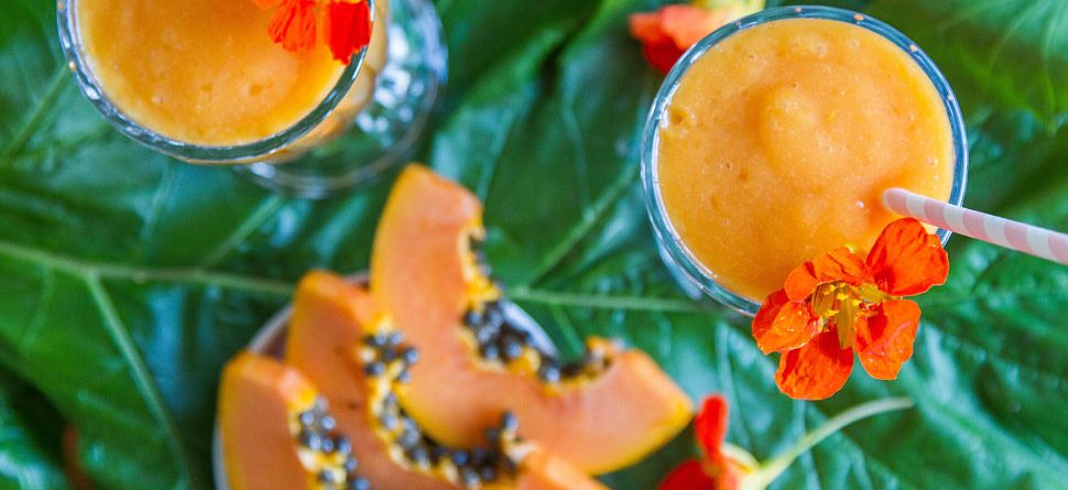 - Using a sharp knife, carefully remove skin from papaya.